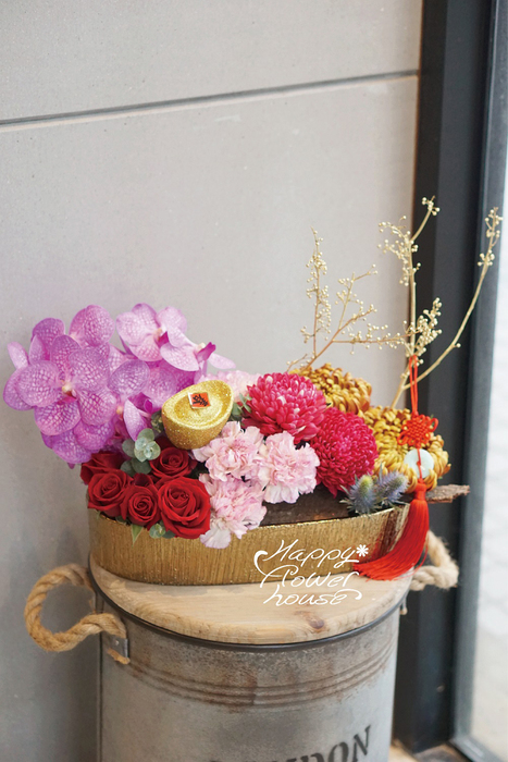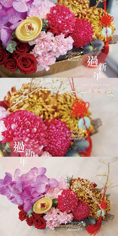 花材: 黃金大菊 國王菊-紅 胡椒木-金 康乃馨-粉邊 巨輪-桃粉 紅玫瑰 薊花 雪松 尤加利 年節飾品 >>如不是當季花,會採用等值及同色系花材替代!! >>花器不挑款,以實際出貨為主) >>若不允許變更請勿下單哦 或來電詢問~(03)-4250-555 注意事項: 1.限桃園中壢區外送,外縣市則委託當地設計師插花出貨。 2.商品因電腦螢幕設定與拍攝光線來源角度不同,進而與實體顏色略有差異,商品顏色請以實物為主。尺寸與其商品本體,略有差異,並非分毫不差,仍以實體為主,敬請見諒