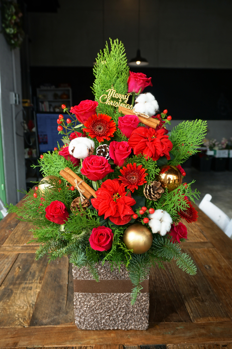 黃金柏 絲柏 紅玫瑰 棉花 聖誕紅 小太陽 火龍果 松果 聖誕飾品